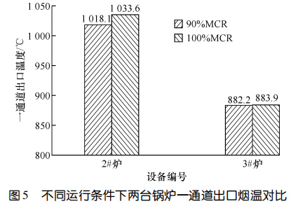 兩臺設備運行 11 個月后進行了能效測試。圖5對比了 90%鍋爐大的連續蒸發量(簡稱 MCR)和MCR 條件下鍋爐一通道的出口煙溫。圖6示出了MCR運行條件下兩臺鍋爐熱效率的對比。結果顯示:在 90%MCR 運行條件下,3#爐一通道出口煙溫比2#爐低 135.9 ℃,在MCR 運行條件下,3#爐一通道出口煙溫比 2#爐低 149.7 ℃,3#爐的熱效率比 2#爐高 0.64%。相較而言,使用膜式壁爐襯的3#爐在負荷相當的情況下,余熱鍋爐熱效率更高。