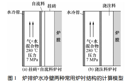 采用有限元分析軟件ANSYS的流體模塊FLUENT對國內外爐排爐常用的兩種水冷壁內襯結構內部的溫度分布進行數值模擬分析。膜式壁結構(掛磚+自流料)和水冷管錨固釘+澆注料兩種爐襯結構的計算模型如圖1所示。