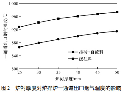 爐襯厚度對一通道出口煙氣溫度的影響兩種水冷壁爐襯的厚度對一通道出口煙氣溫度的影響如圖 2所示。可以看出:兩種爐襯厚度在 25~50 mm 變化時,一通道出口煙溫均高于 850 ℃;兩種水冷壁內襯結構均呈現爐襯越厚一通道出口煙溫越高的趨勢;當兩種爐襯厚度相同時,澆注料爐襯的一通道出口煙溫明顯高于掛磚+自流料爐襯的一通道出口煙溫。